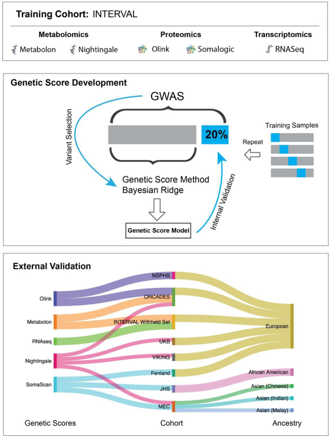 該研究收集大隊(duì)列(N=50000名參與者)血液進(jìn)行廣泛多組學(xué)數(shù)據(jù)檢測(cè):血漿蛋白質(zhì)組學(xué)(N=3175/N=4822)、血漿代謝組學(xué)(Metabolon ,N=8153)、血清代謝組學(xué)(Nightingale,N=37359)和全血Illumina RNA測(cè)序(N=4136)。利用機(jī)器學(xué)習(xí)開發(fā)了遺傳評(píng)分,并評(píng)估了歐洲、亞洲和非洲裔美國(guó)人的遺傳評(píng)分表現(xiàn)。通過(guò)生成UK Biobank3的合成多組分?jǐn)?shù)據(jù)集,使用全表型掃描識(shí)別疾病關(guān)聯(lián),證明了這些多組分遺傳評(píng)分的實(shí)用性。此外,該研究開發(fā)了一個(gè)在線門戶網(wǎng)站OmicsPred(https://www.omicspred.org/),以方便公眾訪問所有遺傳評(píng)分和驗(yàn)證結(jié)果,并作為未來(lái)擴(kuò)展和增強(qiáng)多組分遺傳評(píng)分的平臺(tái)。