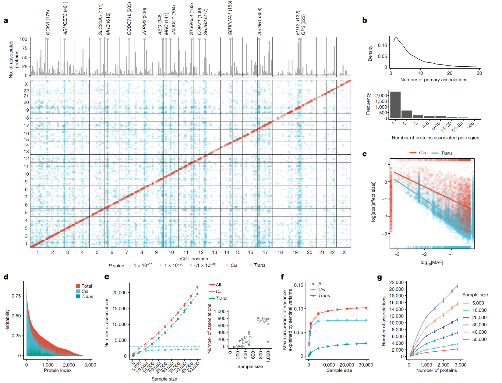 該研究對(duì)54219名UKB參與者的血液樣本進(jìn)行了蛋白質(zhì)組分析。對(duì)2,923種蛋白質(zhì)進(jìn)行全面的蛋白質(zhì)定量特征基因座(pQTL)定位,發(fā)現(xiàn)了涉及3,769個(gè)不同基因位點(diǎn)的14,287個(gè)主要遺傳關(guān)聯(lián),其中81%是以前未報(bào)道過(guò)的。該研究還檢測(cè)了非歐洲個(gè)體的祖先特異性pQTL定位。因此,這項(xiàng)研究提供了一個(gè)更為全面的人體蛋白質(zhì)組學(xué)圖譜,顯著增強(qiáng)了對(duì)蛋白質(zhì)的遺傳和非遺傳調(diào)節(jié)因子的理解,幫助闡明蛋白質(zhì)基因組學(xué)發(fā)現(xiàn)的生物學(xué)機(jī)制,并加速生物標(biāo)志物,預(yù)測(cè)模型和治療方法的發(fā)展。