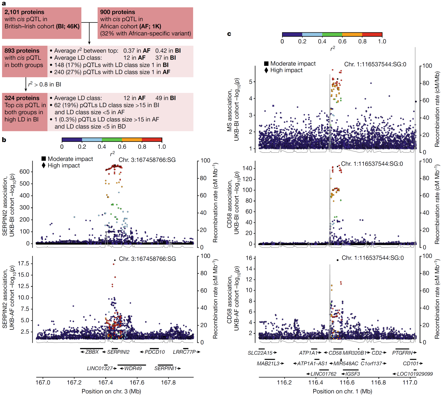 研究團(tuán)隊(duì)使用大約50000多名歐洲、非洲或亞洲血統(tǒng)的UKB參與者的數(shù)據(jù),結(jié)合基因型和表型數(shù)據(jù),使用兩個(gè)高通量蛋白質(zhì)組學(xué)平臺(tái)的關(guān)聯(lián)研究,并對(duì)英國(guó)或愛爾蘭、非洲和南亞祖進(jìn)行了分層。兩個(gè)平臺(tái)上檢測(cè)到的順式蛋白定量性狀基因座的數(shù)量相似(Olink上為2101個(gè),SomaScan上為2120個(gè)),但在Olink平臺(tái)上,具有此類檢測(cè)性能支持證據(jù)的檢測(cè)比例更高(72%對(duì)43%)。該研究證明了不同平臺(tái)之間的差異有時(shí)也會(huì)提供有用的互補(bǔ)性,并展示了利用英國(guó)生物庫(kù)參與者的不同祖先如何幫助檢測(cè)新的關(guān)聯(lián)并重新確定基因組位置。