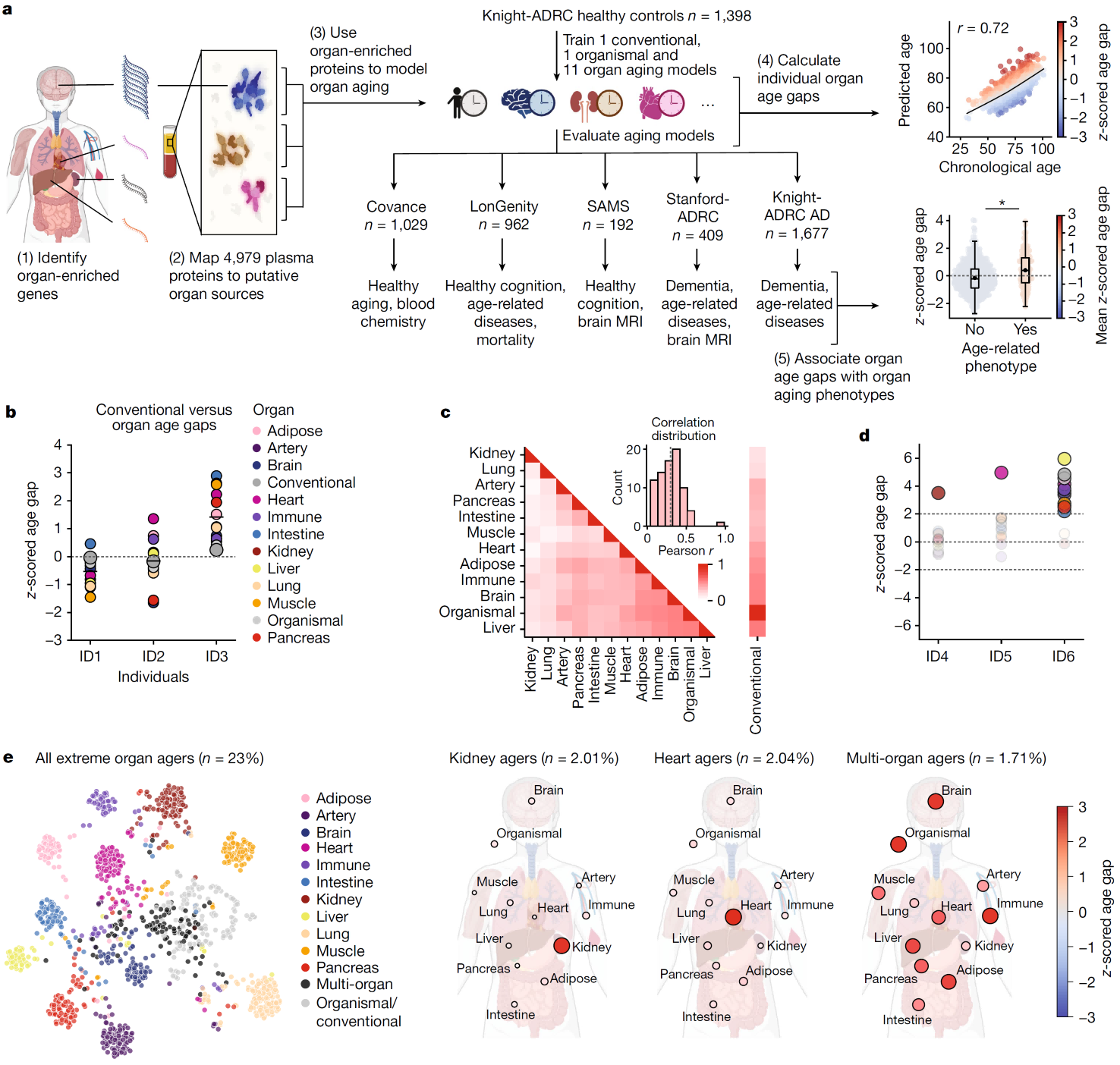 該研究在5個(gè)獨(dú)立隊(duì)列的5676個(gè)受試者的血漿中測(cè)定了4979個(gè)蛋白,并依據(jù)人類器官RNA-seq數(shù)據(jù)繪制了可能的器官特異性血漿蛋白圖譜,使用機(jī)器學(xué)習(xí)方法開發(fā)器官衰老模型。發(fā)現(xiàn)心臟加速老化的個(gè)體心力衰竭風(fēng)險(xiǎn)增加250%,大腦和血管加速老化可預(yù)測(cè)阿爾茨海默病(AD)的進(jìn)展。該研究開發(fā)基于血漿蛋白質(zhì)組數(shù)據(jù)的算法模型將血管鈣化、細(xì)胞外基質(zhì)改變和突觸蛋白脫落與早期認(rèn)知能力下降聯(lián)系起來(lái)。該方法簡(jiǎn)單有效,并從分子層面為器官衰老提供新的理解。