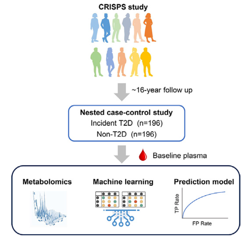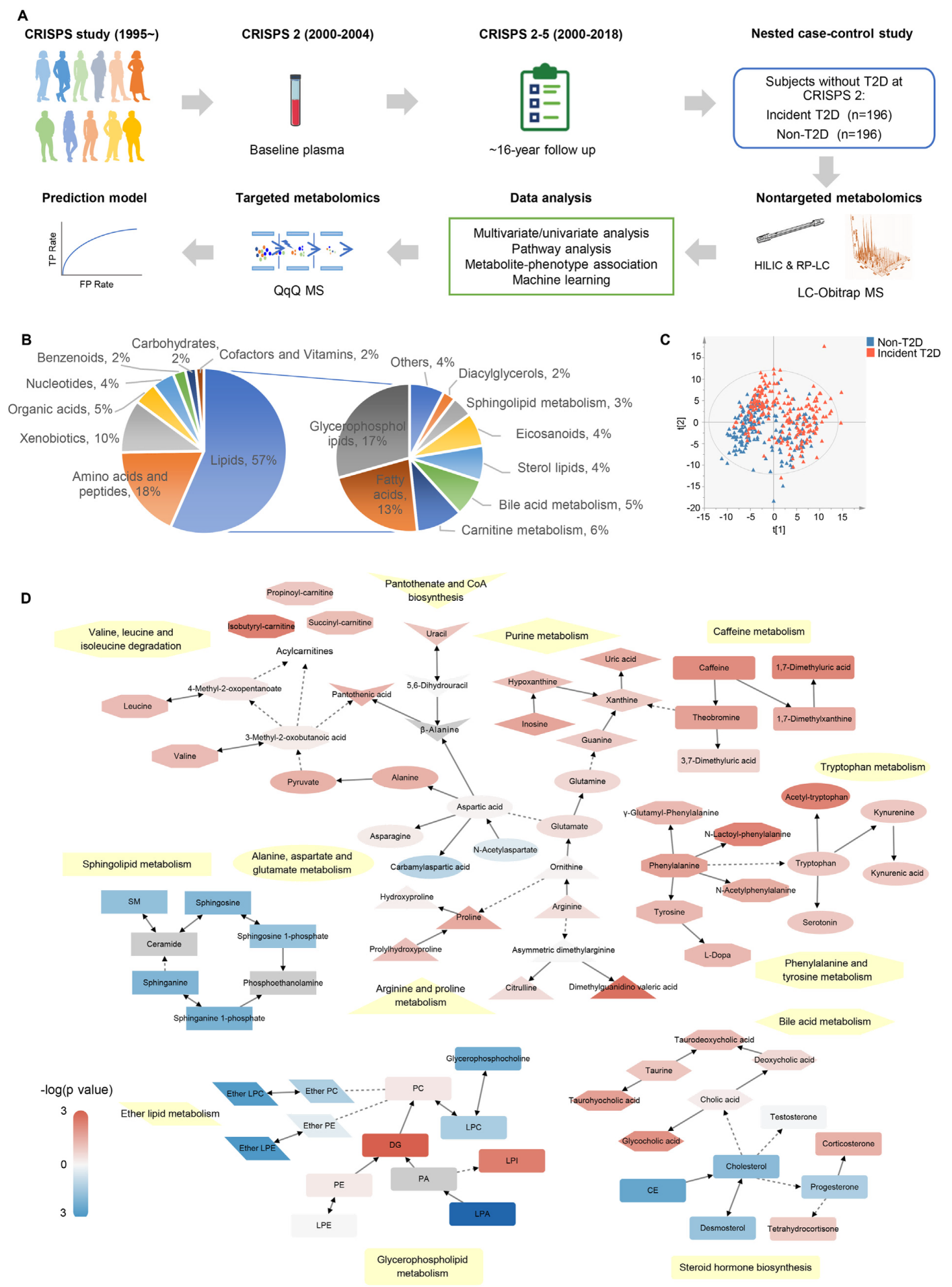 對(duì)香港心血管危險(xiǎn)因素患病率研究(CRISPS)隊(duì)列參與者(來(lái)自196例T2D患者和196名年齡和性別匹配的非T2D對(duì)照者)的血漿樣本進(jìn)行代謝物檢測(cè)和差異分析;