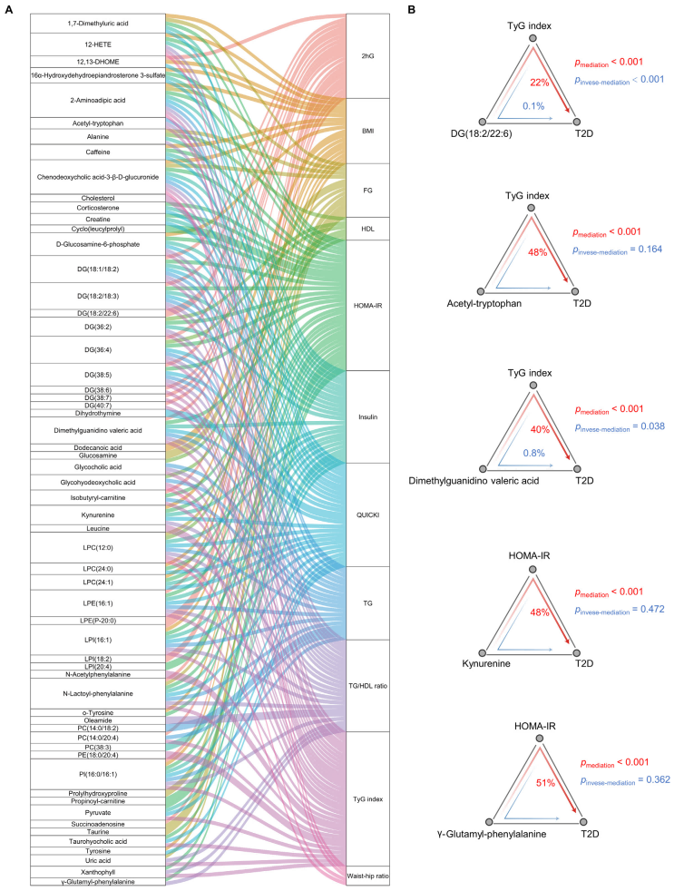 通過(guò)分析代謝產(chǎn)物對(duì)臨床危險(xiǎn)因素介導(dǎo)的T2D事件的貢獻(xiàn),共建立了457個(gè)中介聯(lián)系,這些中介聯(lián)系主要由TyG指數(shù)、TG、TG/HDL比值、HDL、腰臀比、QUICKI和HOMAIR介導(dǎo),20.6%的中介聯(lián)系是控制胰島素抵抗(TyG指數(shù)和HOMA-IR),10.3%是通過(guò)胰島素敏感性(QUICKI)。特別地,TyG指數(shù)介導(dǎo)DG(18:2/22-6)、乙酰色氨酸和二甲基胍戊酸對(duì)T2D的影響分別為22%、48%和40%(圖5B)。這些觀察結(jié)果表明,代謝產(chǎn)物和危險(xiǎn)因素可能導(dǎo)致T2D事件。